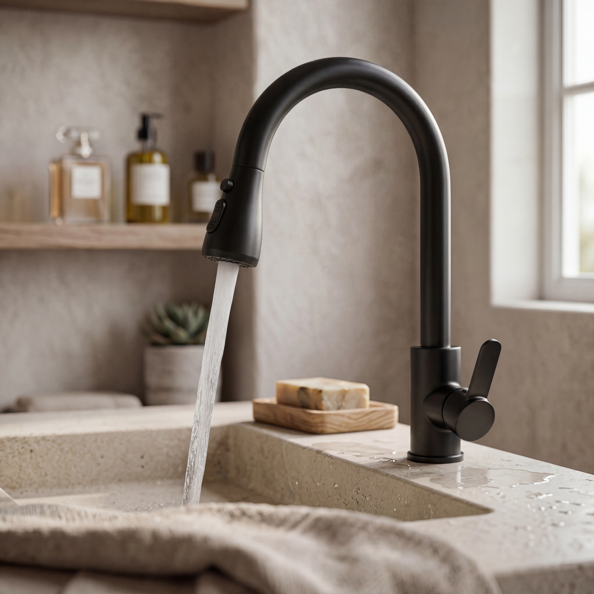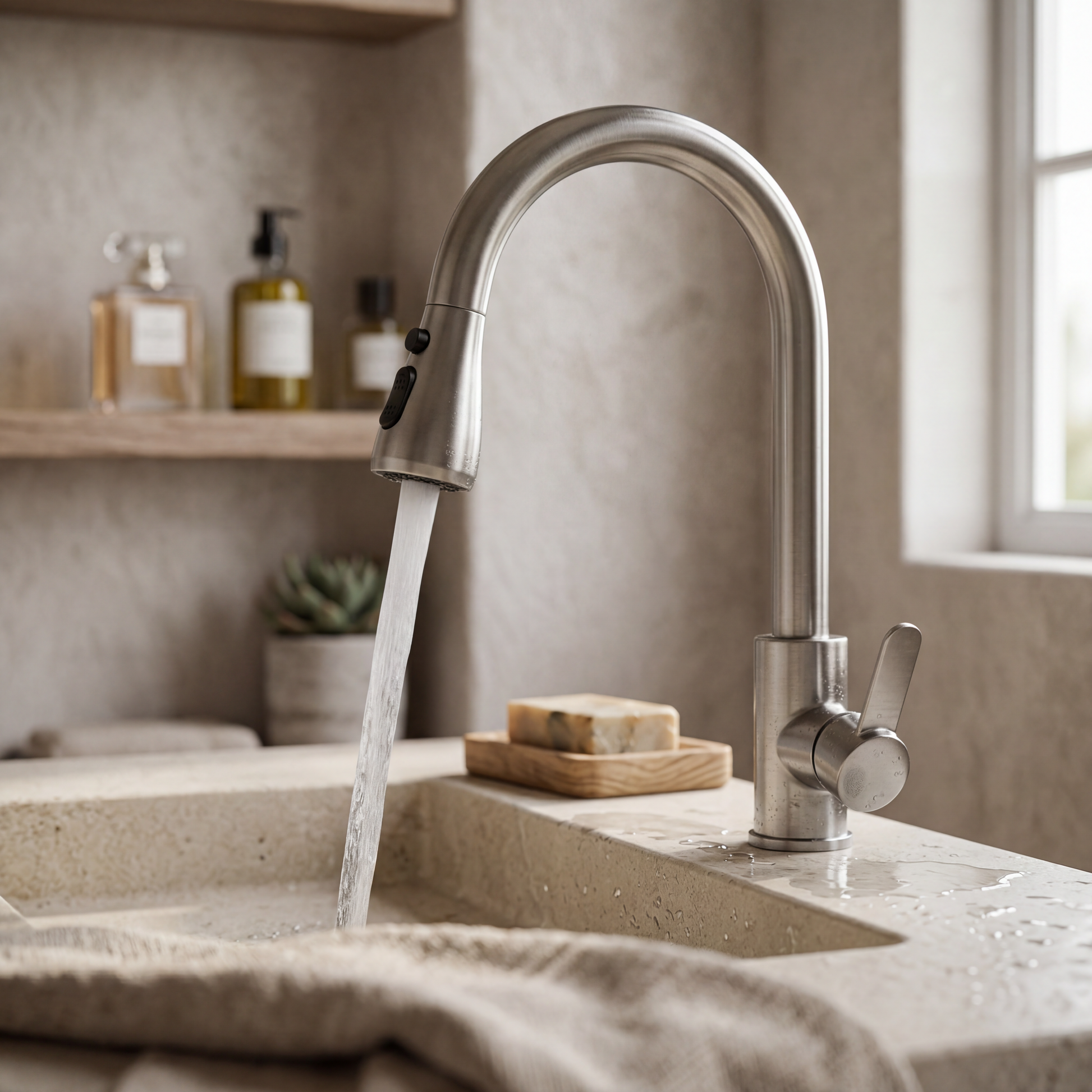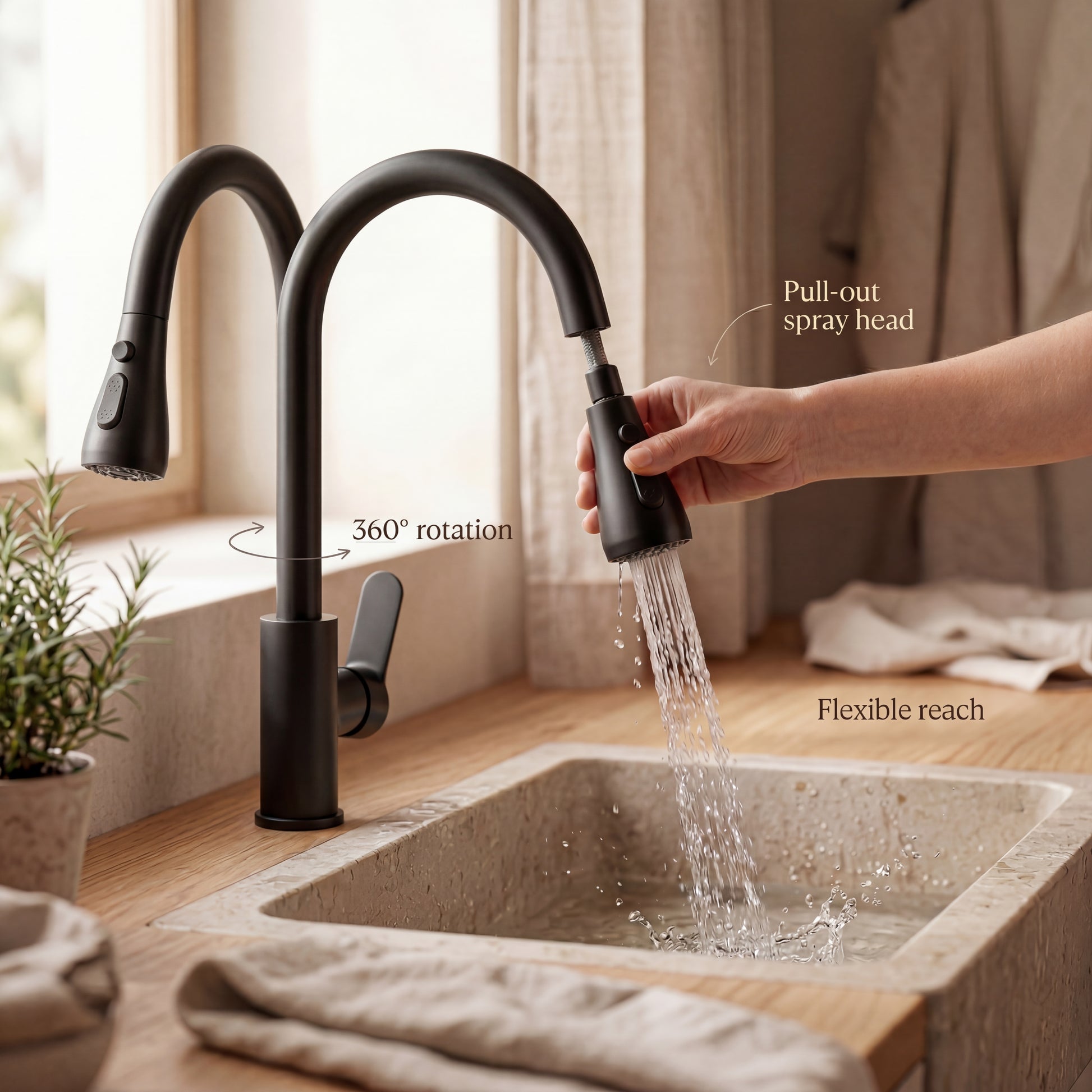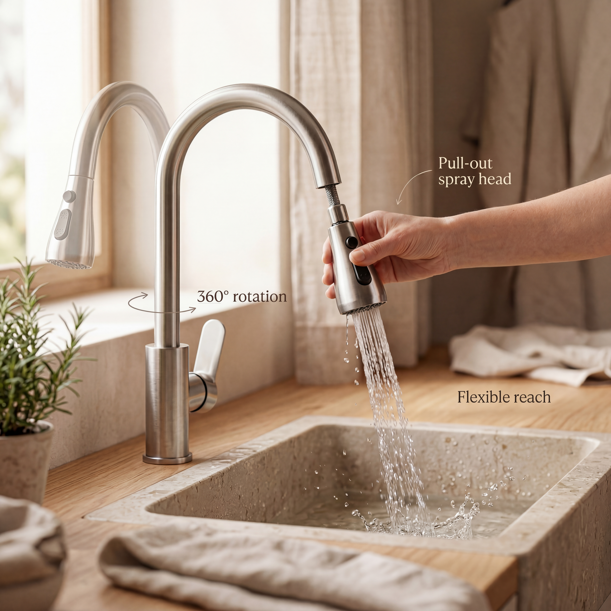 Dankzij het spatvrije ontwerp blijven je aanrechten schoon en droog. Met de soepele bediening en eenvoudige installatie is deze kraan een praktische en stijlvolle toevoeging aan elke keuken.