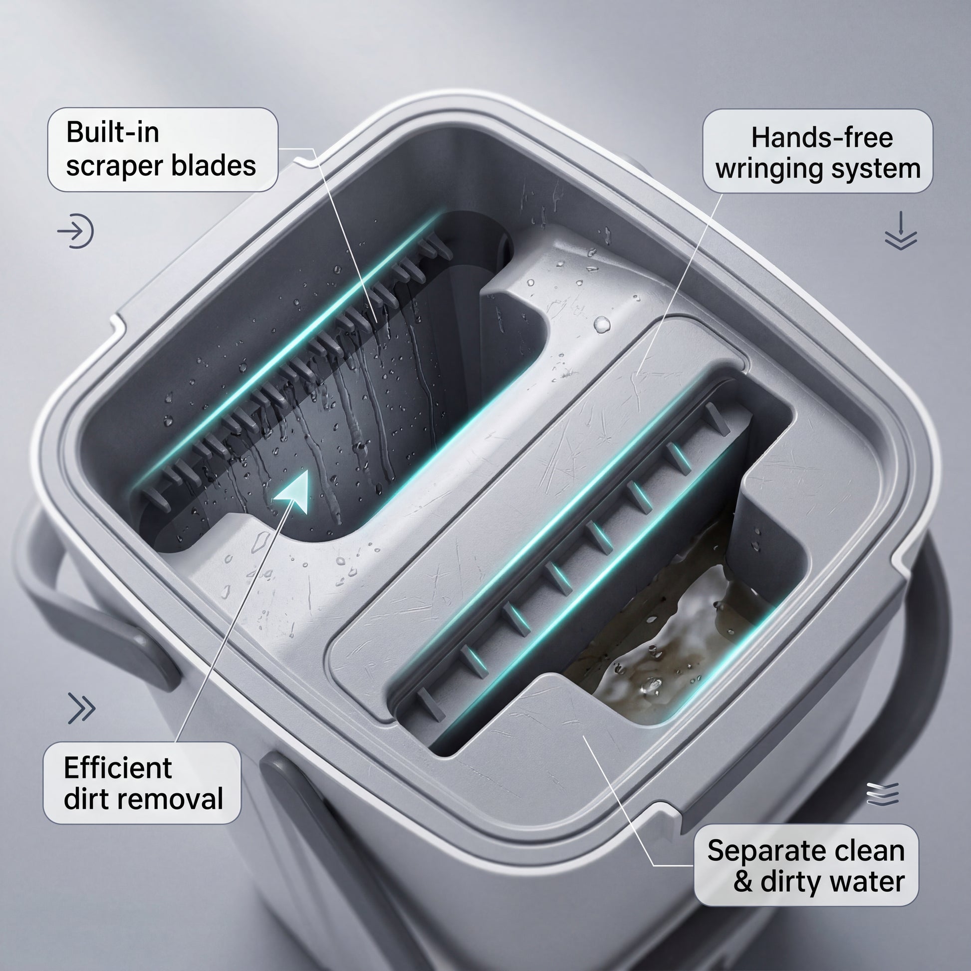 Het dubbel-kamer systeem scheidt schoon en vuil water, zodat je altijd met schoon water schoonmaakt.